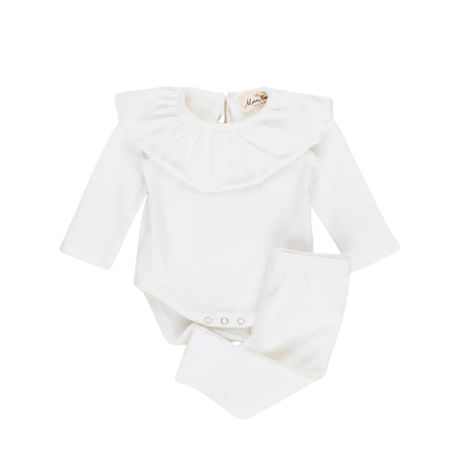 Get your little one ready to ruffle in this cute cotton outfit! The ruffle shoulder overlay adds a playful touch to this matching set, perfect for your stylish girl. Complete with comfy leggings, this outfit is a must-have for any fashion-forward child.