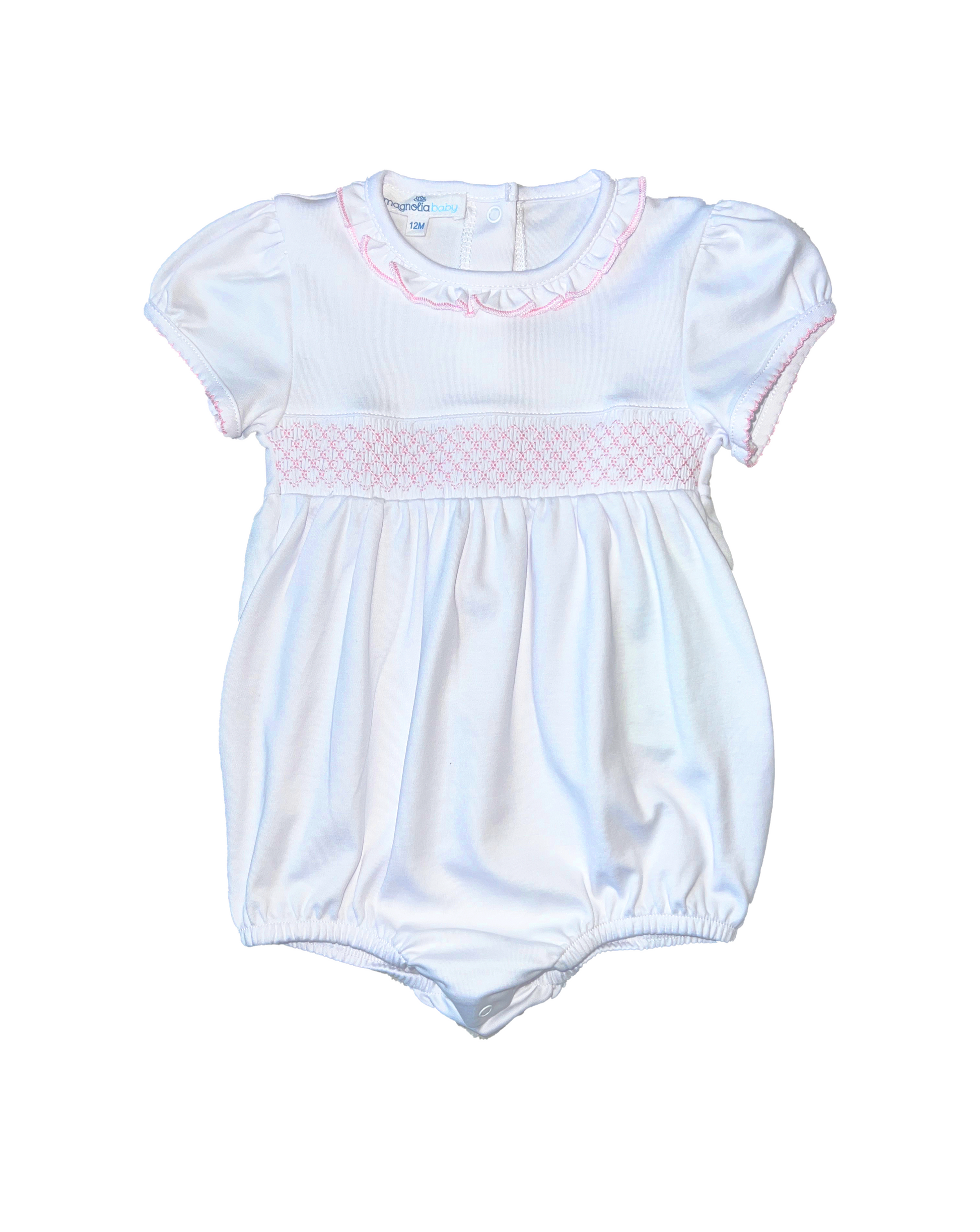 Discover timeless elegance with the Magnolia Baby Essentials Solid Smocked Bubble in White Pink. This adorable baby bubble is crafted from the softest Pima cotton, ensuring ultimate comfort for your little one's delicate skin. Featuring exquisite hand-smocking across the chest, this piece exudes classic charm. The subtle pink picot trim along the edges adds a sweet, refined touch. Perfect for any occasion, this bubble is a wardrobe essential.