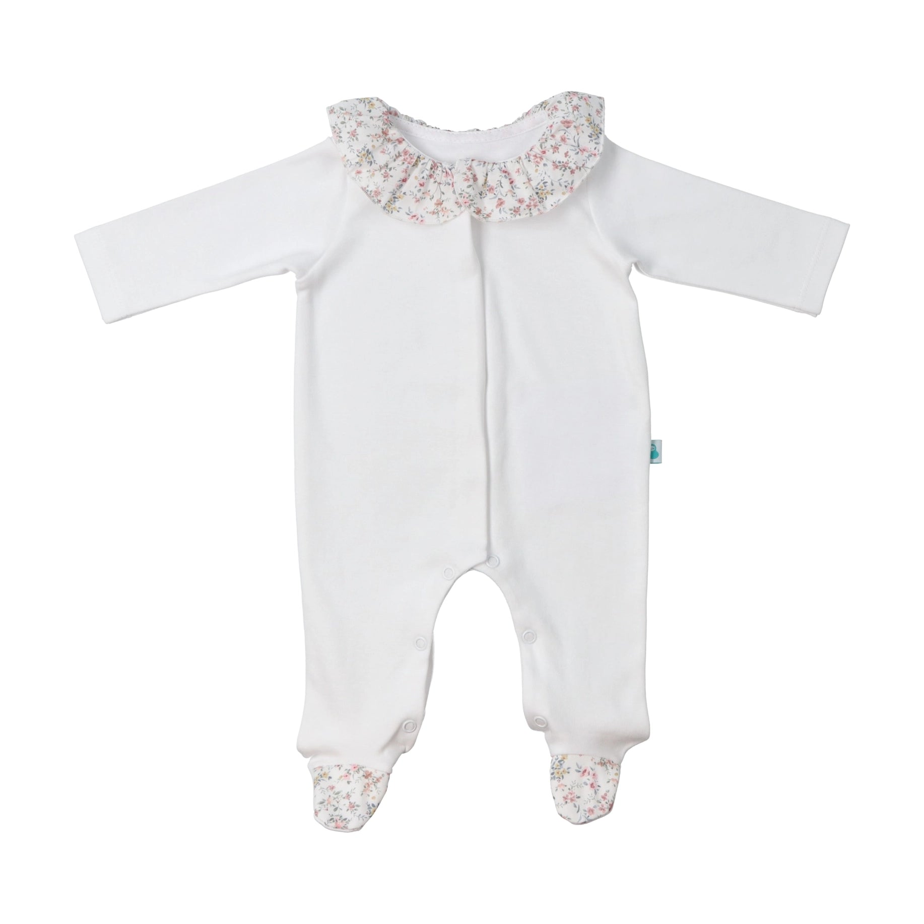 A sweet and timeless baby girl bodysuit featuring a delicate floral print and a classic Peter Pan collar—perfect for everyday elegance or special occasions.