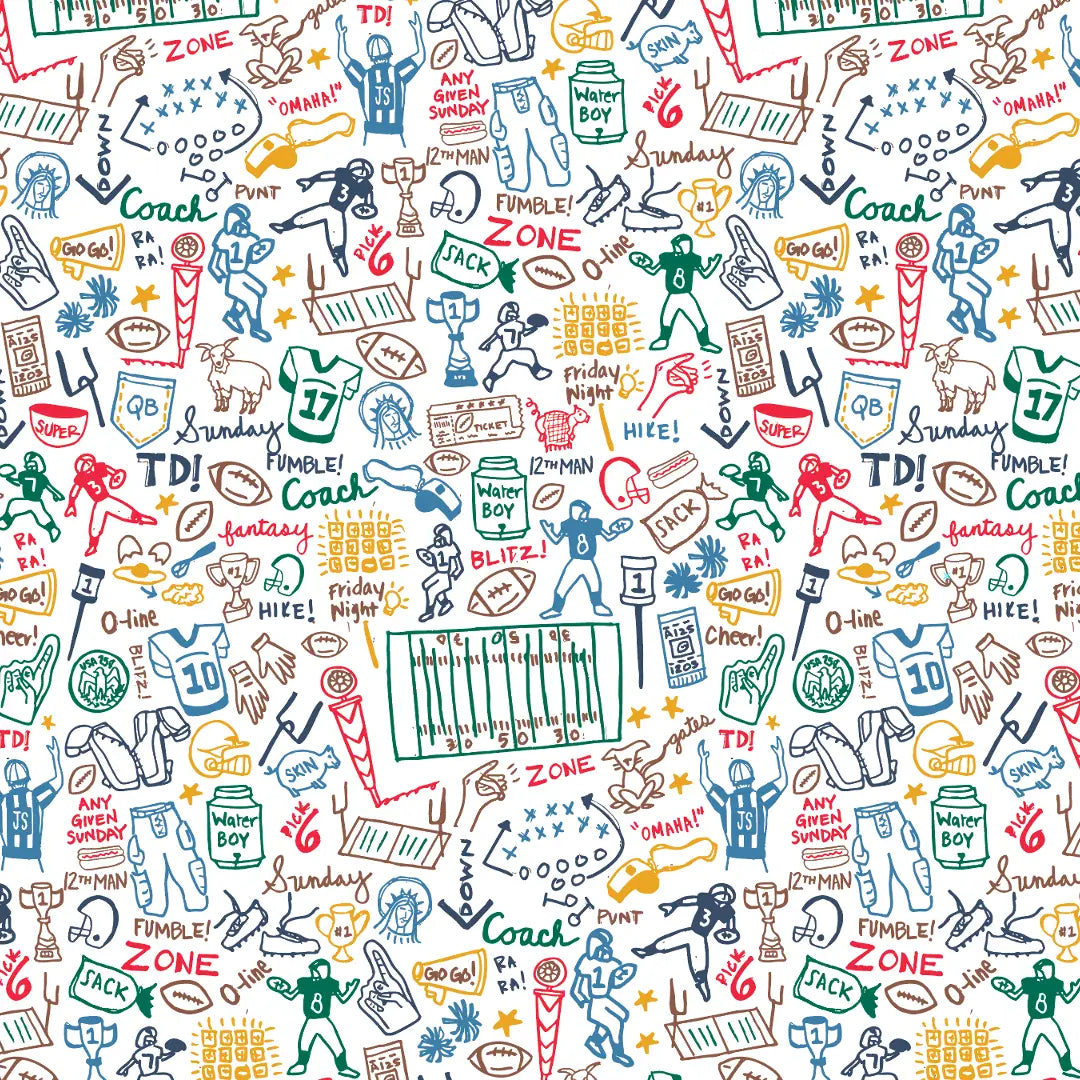 Game on! This hand-drawn Football boy’s polo brings all the excitement of the field to your little one’s wardrobe. Featuring a playful mix of footballs, helmets, goalposts, playbooks, and game-day snacks, this sporty print is full of details to explore from kickoff to the final whistle. The perfect gift for the football fans in your life — sure to be a winning look!
