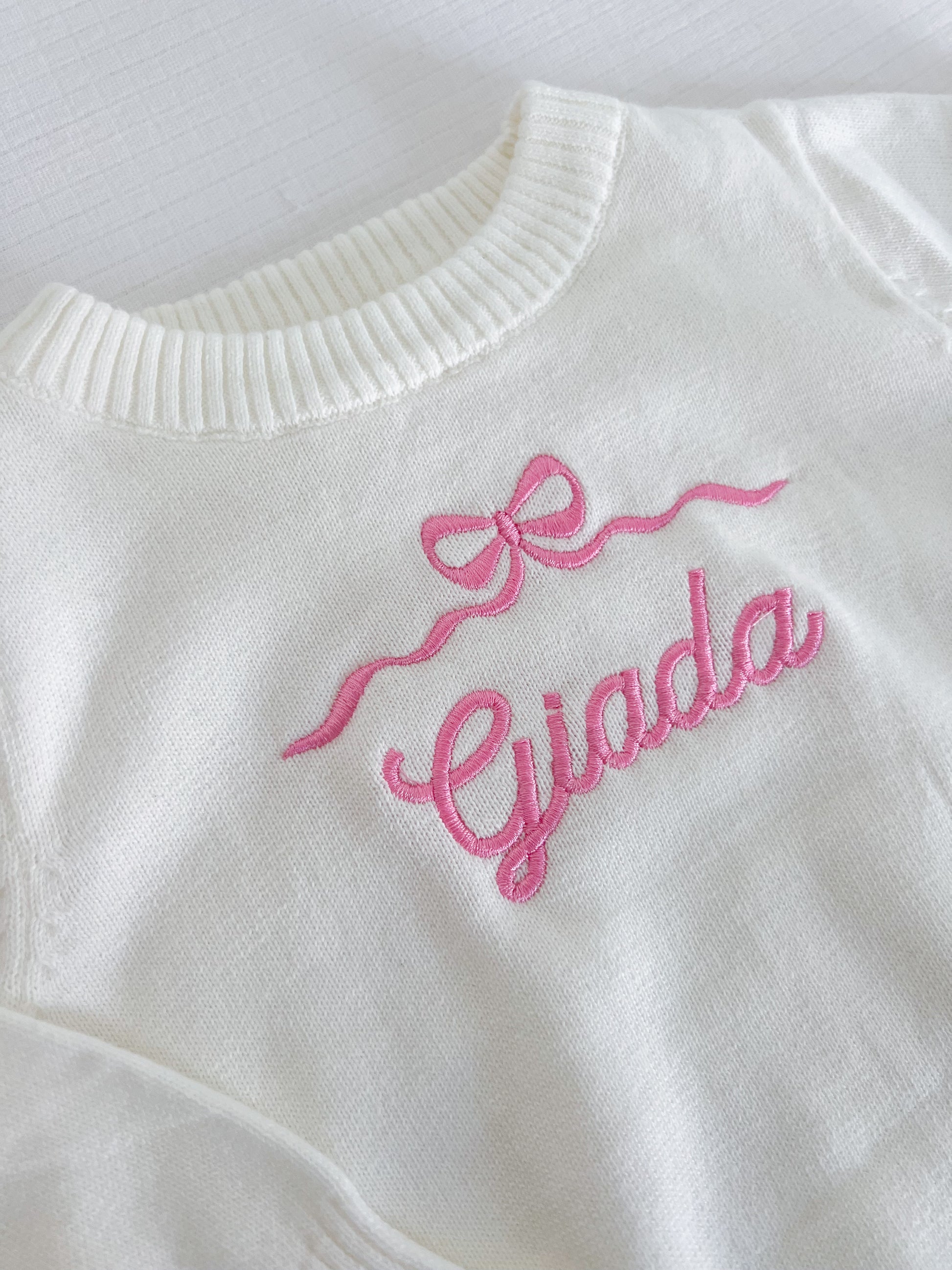 Cozy up in timeless style with our Satin Bow Monogrammed White Sweater—the perfect canvas for personalization! This soft, versatile piece features your child's name or initials beautifully embroidered, making it a cherished favorite for everyday wear or special occasions. Pick our a frame, font and thread color and enjoy a beautifully embroidered piece.