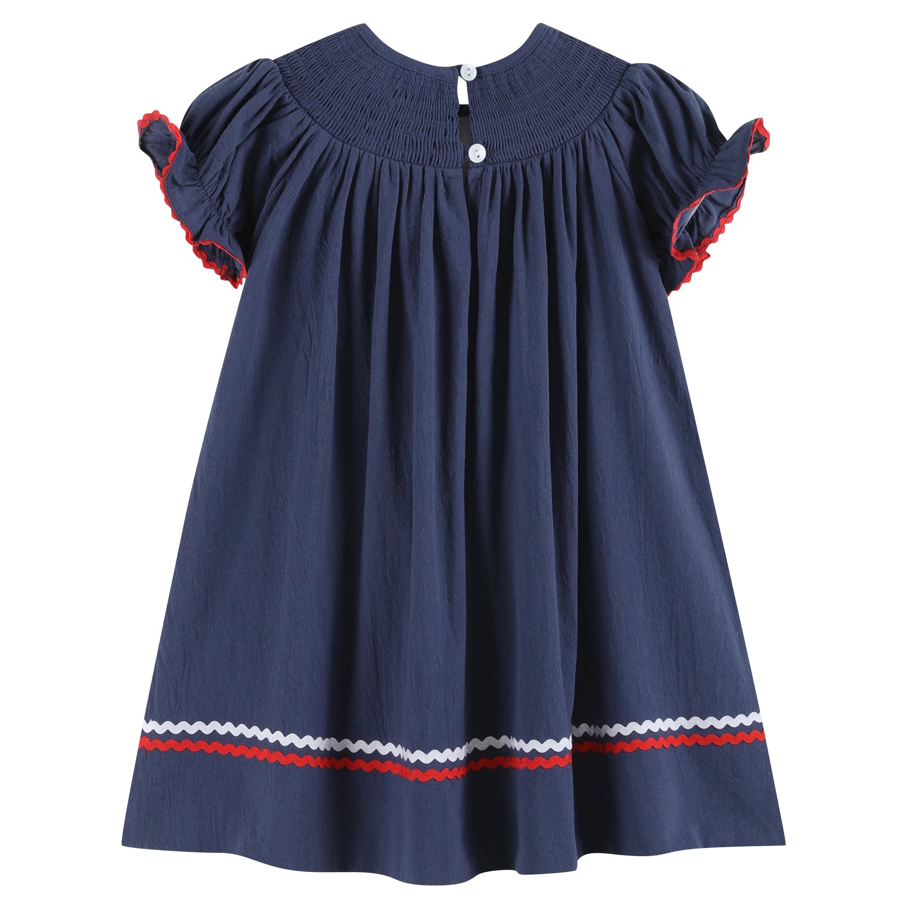 Spread holiday cheer with our Navy Blue Santa Smocked Bishop Dress! Adorned with delightful smocking along the neckline featuring embroidered Santa, this dress is the perfect blend of winter charm and Christmas cuteness. Made in a pretty navy cotton, it's an adorable choice for festive occasions and merry celebrations.