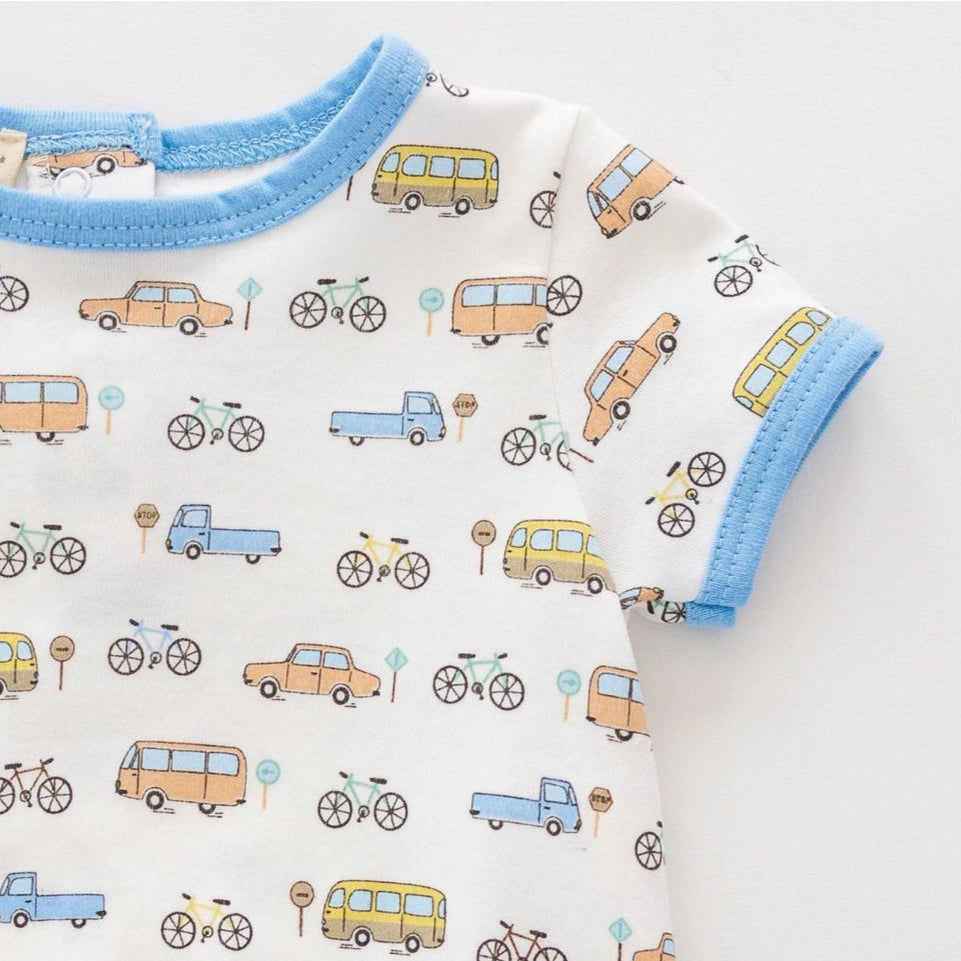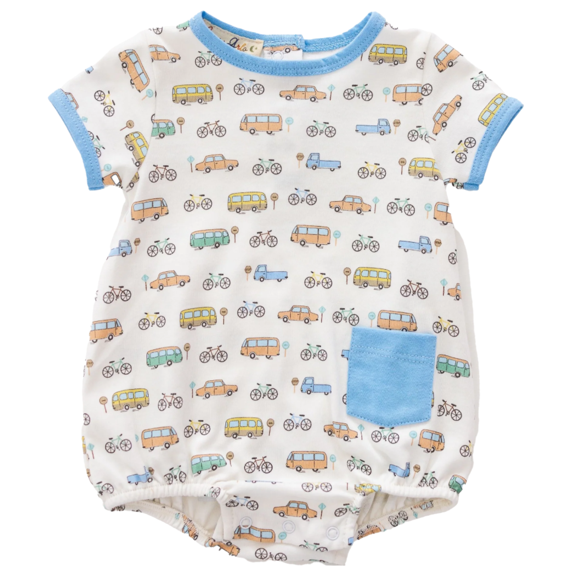 A charming one-piece bubble romper made from ultra-soft, breathable 100 % Pima cotton—perfect for little explorers.